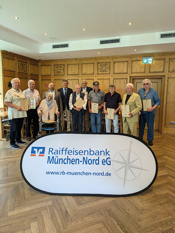 Die geehrten Mitglieder mit Vorstand Jürgen Kaltenbacher (3. v.l.) und dem Aufsichtsratsvorsitzenden Johannes Past (4.v.l.) kommen gemeinsam auf 450 Jahre Mitgliedschaft bei ihrer Raiffeisenbank München-Nord.