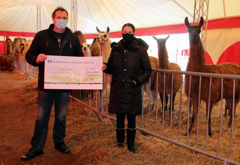 Bereits seit Mitte August hat der Zirkus Barnum seine Zelte auf dem Volksfestplatz in Unterschleißheim aufgeschlagen, da aufgrund der aktuellen Situation keine Vorstellungen mehr stattfinden dürfen. Eine harte Zeit für die Schausteller-Familie und ihre Tiere. Über eine Unterstützung in Höhe von 2.500 Euro darf sich einer der tierreichsten Wanderzirkusse Deutschlands jetzt freuen. Der Tierschutzverein Schleißheim und die Raiffeisenbank München-Nord eG unterstützen gemeinsam den Zirkus, sodass nun eine große Menge an Futter angeschafft und die Tiere auch weiterhin gut versorgt werden können.