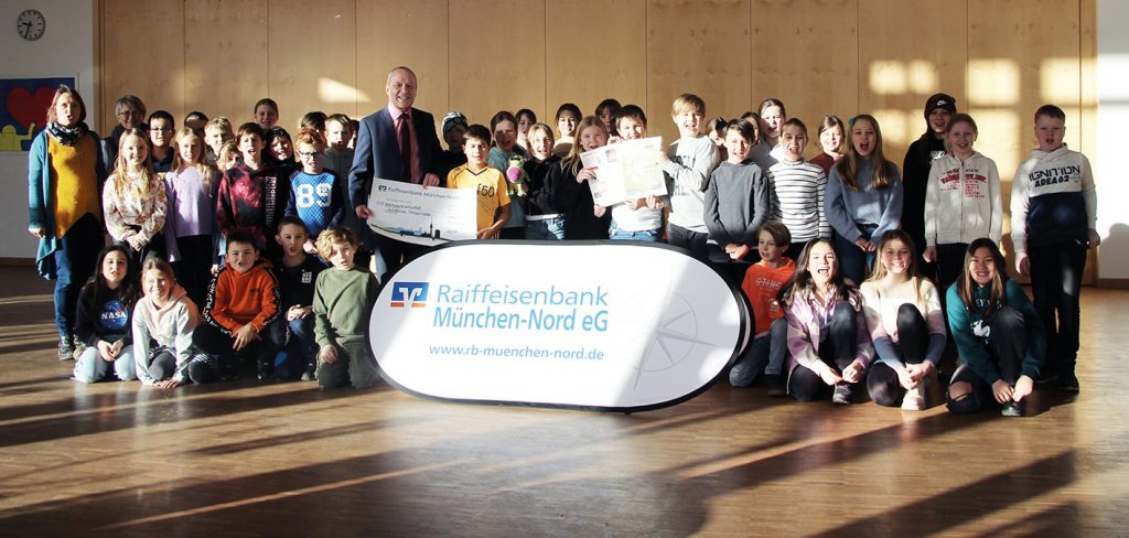Die Raiffeisenbank München-Nord spendet 2.900 Euro für ein Leseprojekt an der Grundschule Fahrenzhausen